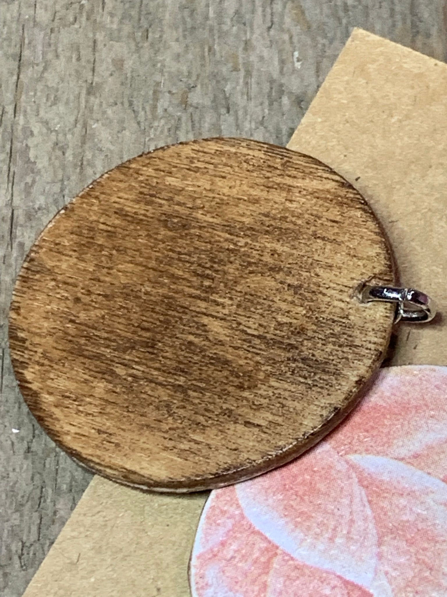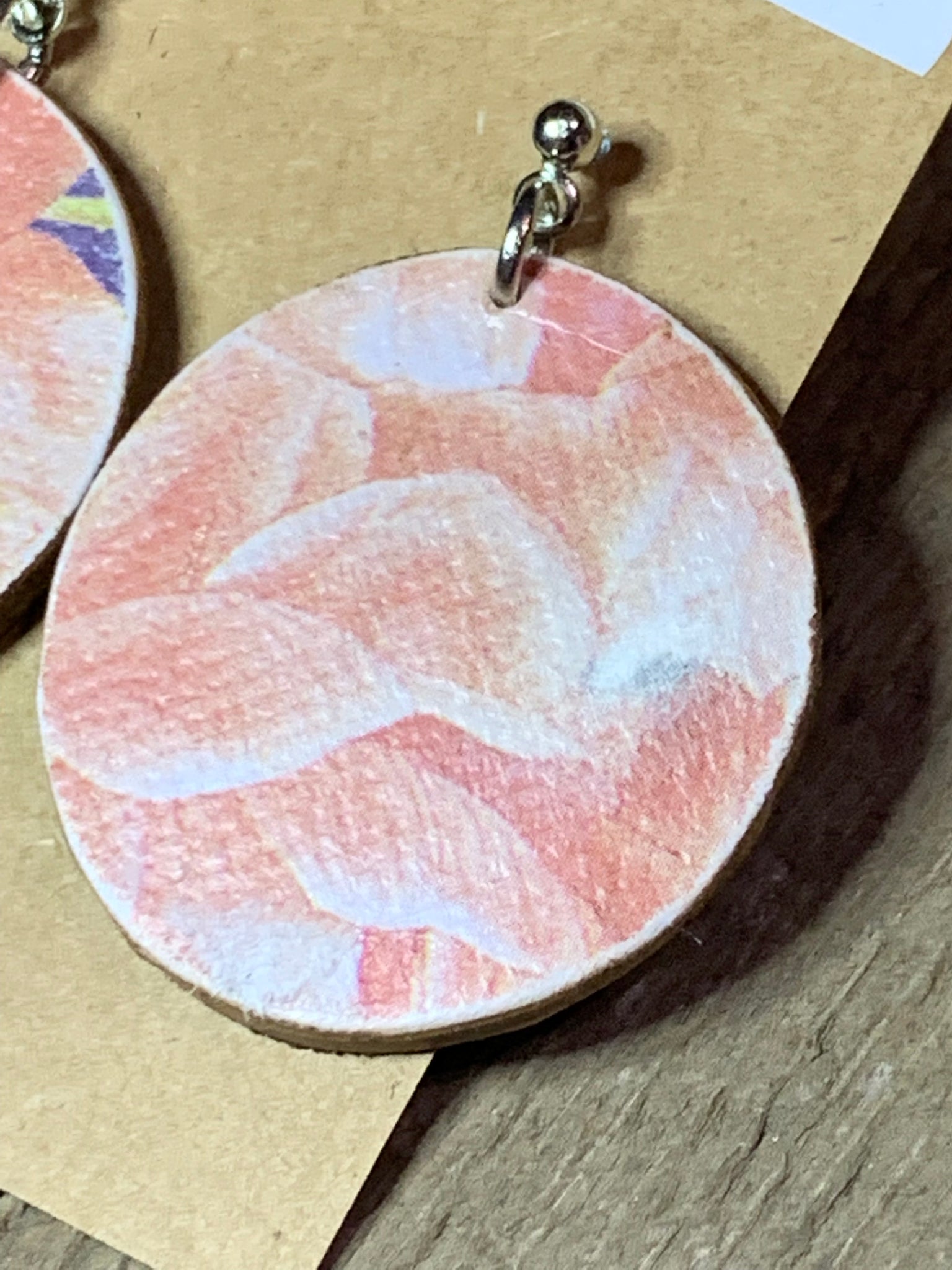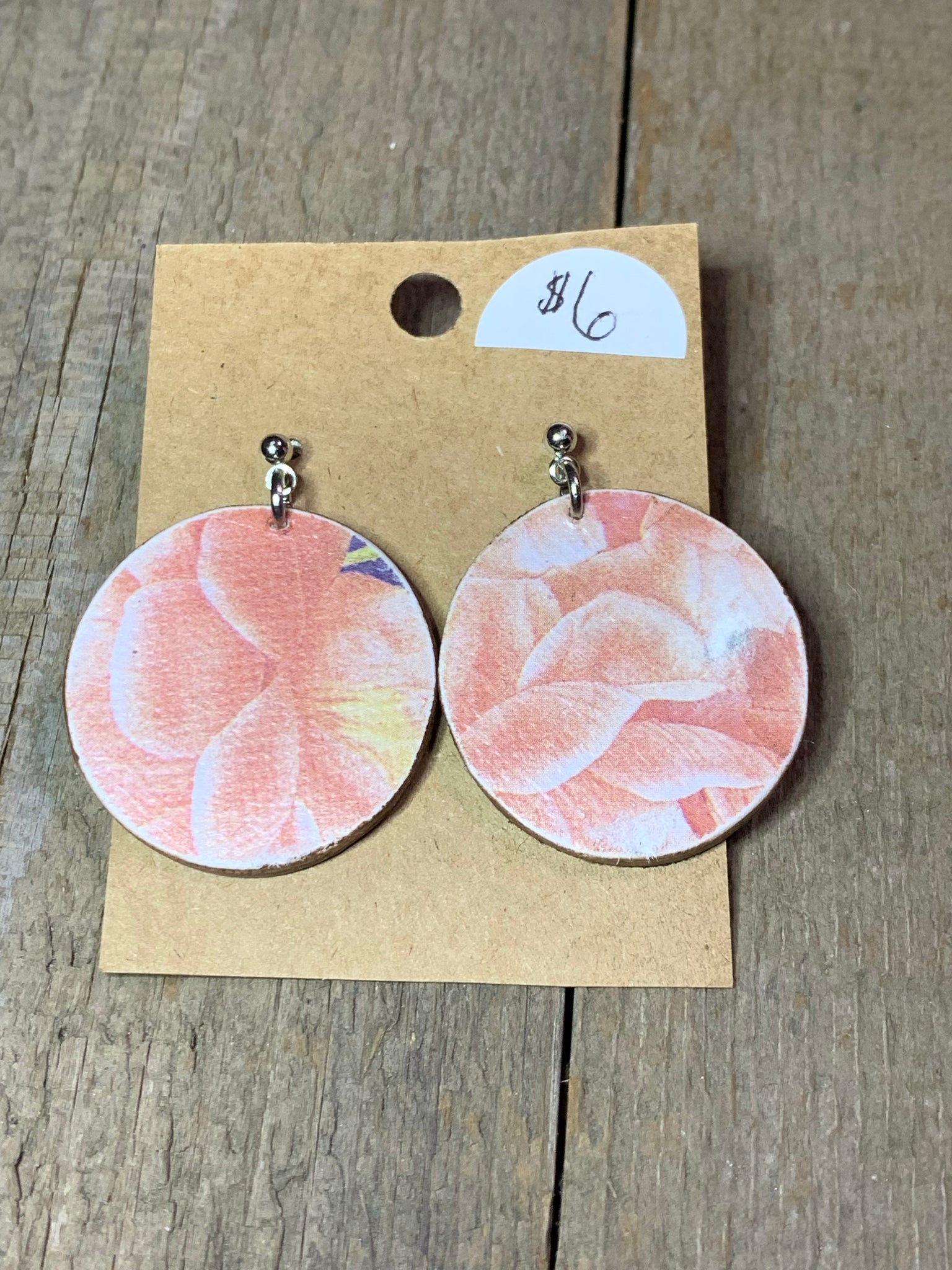 CLEARANCE ITEM!! These beautiful wood round dangles or a gorgeous pale pink but almost a coral tone. Very light weight.