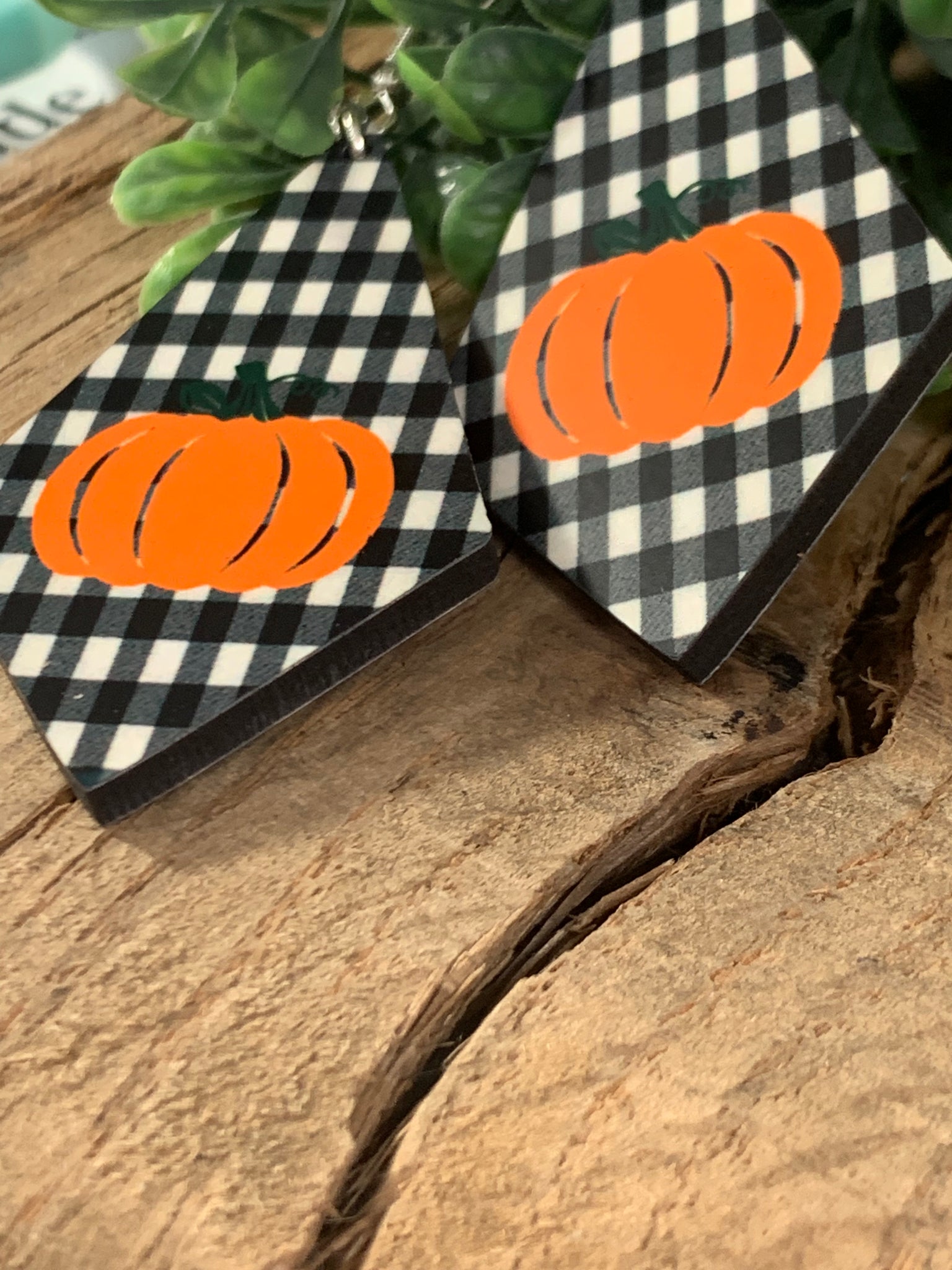 Time to think fall and what is any better than plaid and pumpkins. These are printed double sided and are wood Very light weight. Approximately 1.2” by 2”.